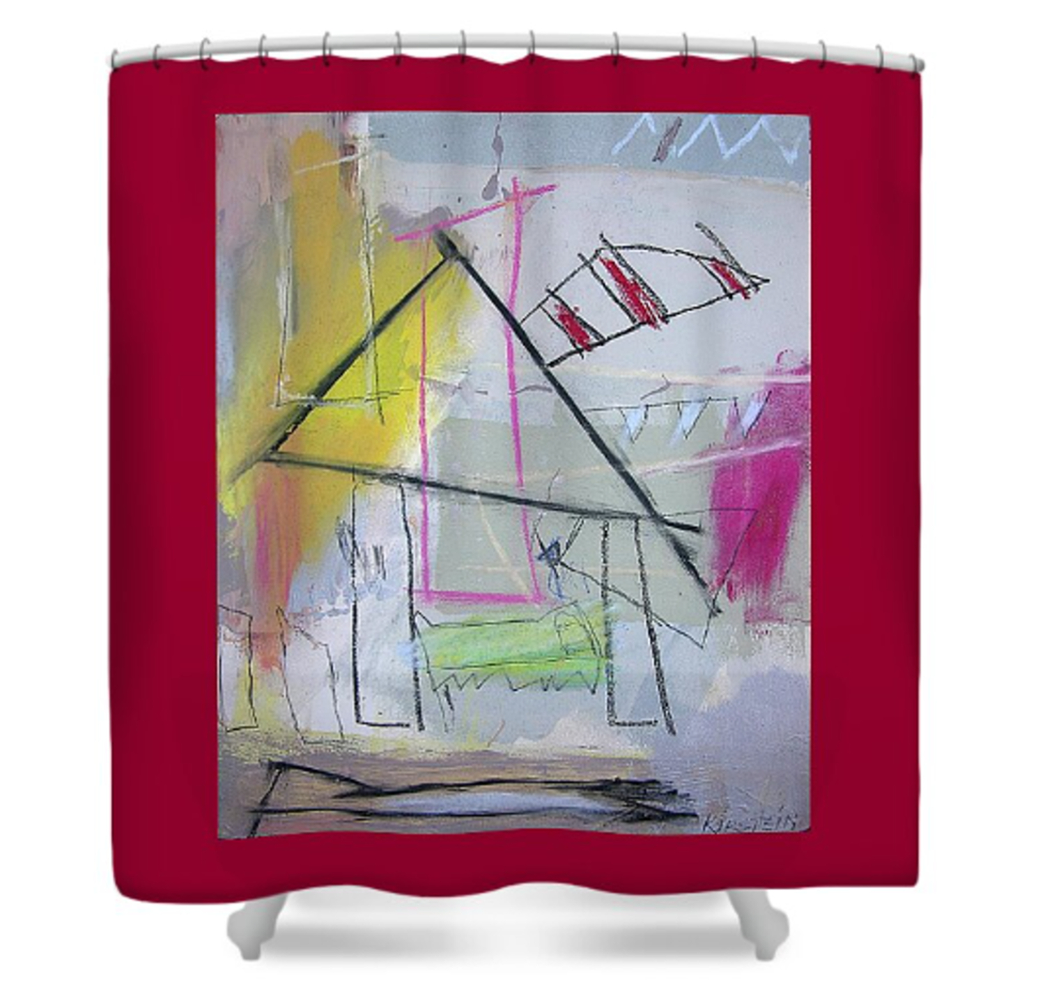 The central focus of my Exhibit would be a large shower curtain with one of my mixed-media drawings of a home drawn in the manner of a child's memory. Home is a state of mind and the action in the drawing moves in and out of the home and its entire placement. "Displaced Home" could be a psychological state similar to disassociation from self. Home becomes a symbol of the relationship of self. Displacement can be a feeling of not belonging, even when physically present in a space. The idea that someone can experience displacement without being physically displaced resonates deeply with the experiences of many individuals who have faced exclusion, marginalization, or discrimination. It could be due to their identity, beliefs, culture, or simply being different. The shower curtain concept resonates perfectly with the idea that memories of home are fragile, temporary, and susceptible to change. The fact that the shower curtain is often associated with privacy, intimacy, and daily routines adds another layer of depth to the artwork on a shower curtain in a refugee's foreign bathroom setting and provides a powerful commentary on the displacement experience. The absurdity, nostalgia, and grief are all apparent through this juxtaposition.